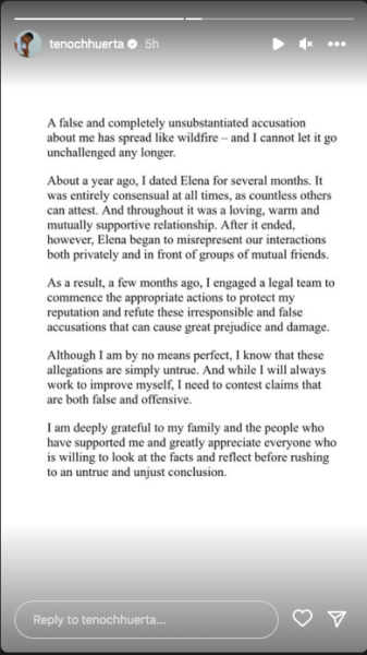 Soon after she went public with her accusations, Tenoch Huerta released a statement denying everything. According to the actor, his accuser is an ex who “began to misrepresent” their “interactions both privately and in front of groups of mutual friends” after they broke up. He added,