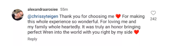 While the couple’s first embryo transfer with Alexandra did not survive, they were “overjoyed” to learn that she later had become pregnant with a little boy. In the comment section of Teigen’s post, Alexandra thanked the famous couple for picking her to carry their baby. She reportedly said,