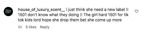 “I just think she need a new label !! 1501 don’t know what they doing !! The girl hard 1501 for tik tok kids lord hope she drop them bet she come up more”