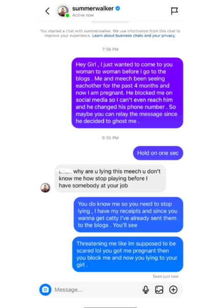 “Hey girl, I just wanted to come to you woman to woman before I go to the blogs . Me and Meech been seeing eachother for the past 4 months and now I am pregnant. He blocked me on social media so I can’t even reach him and he changed his phone number . So maybe you can relay the message since he decided to ghost me. “