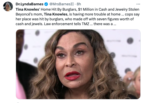 According to recent reports, Ms. Tina Knowles Lawson was the latest target in a string of high profile home invasions, and was robbed of seven figures worth of goods.