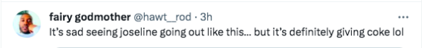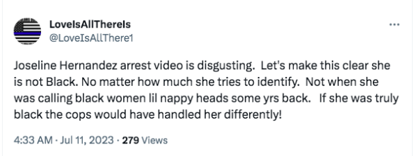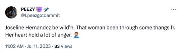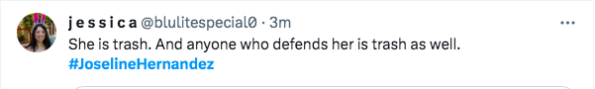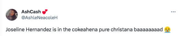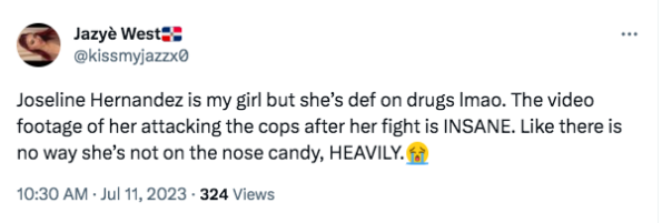 “Joseline Hernandez is my girl but she’s def on drugs lmao. The video footage of her attacking the cops after her fight is INSANE. Like there is no way she’s not on the nose candy, HEAVILY.”