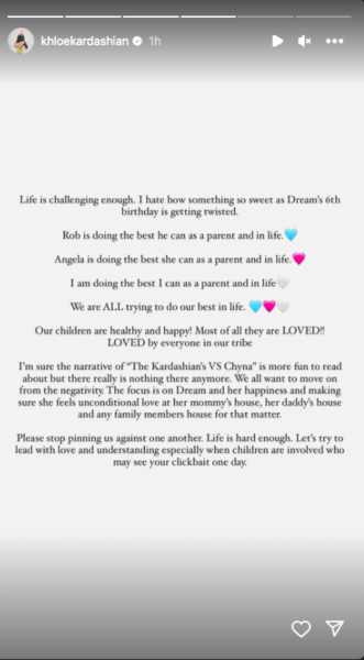 “Life is challenging enough. I hate how something so sweet as Dream’s 6th birthday is getting twisted. / Rob is doing the best he can as a parent and in life. / Angela is doing the best she can as a parent and in life. / I am doing the best I can as a parent and in life / We are ALL trying to do our best in life. / Our children are healthy and happy! Most of all they are LOVED!! / LOVED by everyone in our tribe / I’m sure the narrative of ‘The Kardashian’s VS Chyna’ is more fun to read about but there really is nothing there anymore. We all want to move on from the negativity. / The focus is on Dream and her happiness and making sure she feels unconditional love at her mommy’s house, her daddy’s house and any family members house for that matter. / Please stop pinning us against one another. Life is hard enough. Let’s try to lead with love and understanding especially when children are involved who may see your clickbait one day.”