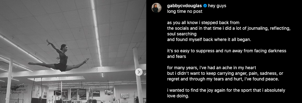 After all the drama went down, Douglas seemingly took a long pause, stepping away from social media and gymnastics altogether. Back in August of last year, the athlete announced her departure, stating she needed to take some time to work on her mental health. Now, it seems Douglas is ready to put her best foot forward. At the end of her recent post, she concluded: