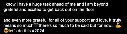 “i know i have a huge task ahead of me and i am beyond grateful and excited to get back out on the floor/and even more grateful for all of your support and love. it truly means so much, there’s so much to be said but for now….let’s do this #2024″