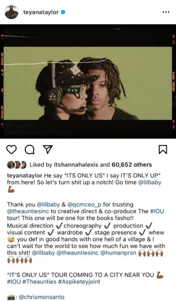 “He say “ITS ONLY US” I say IT’S ONLY UP” from here! So let’s turn shit up a notch! Go time @lilbaby. Thank you @lilbaby & @qcmceo_p for trusting @theauntiesinc to creative direct & co-produce The #IOU tour! This one will be one for the books fasho!!”