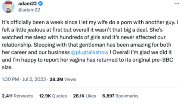 “It’s officially been a week since I let my wife do a porn with another guy. I felt a little jealous at first but overall it wasn’t that big a deal. She’s watched me sleep with hundreds of girls and it’s never affected our relationship. Sleeping with that gentleman has been amazing for both her career and our business @plugtalkshow!”
