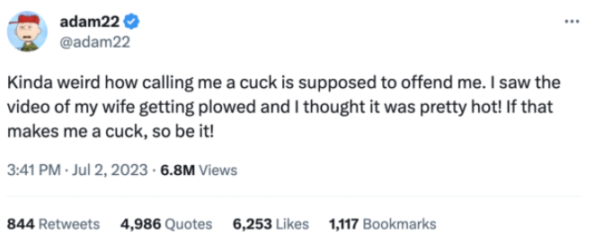 “Kinda weird how calling me a cuck is supposed to offend me. I saw the video of my wife getting plowed and I thought it was pretty hot! If that makes me a cuck, so be it!”