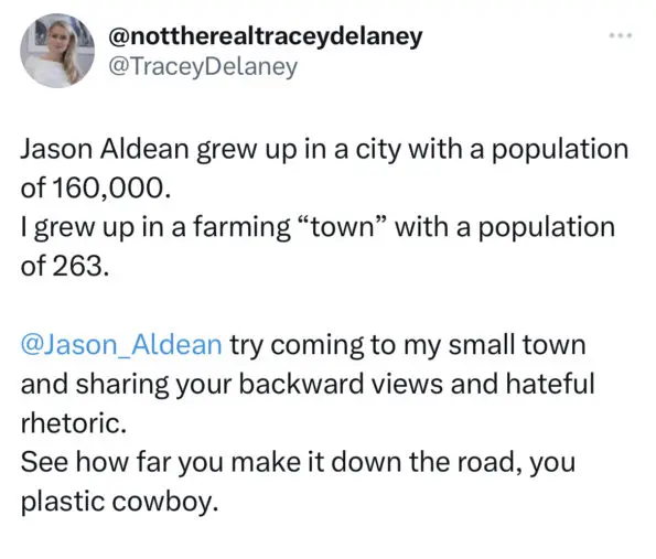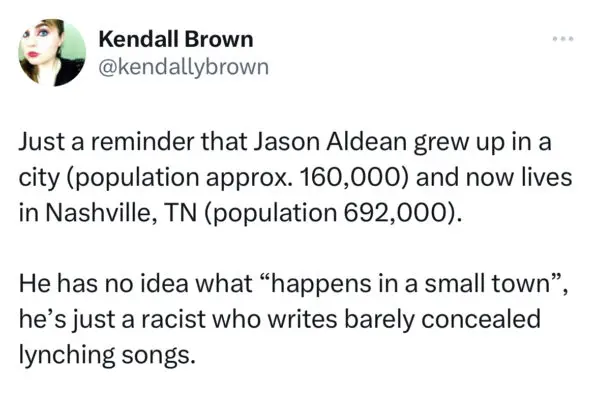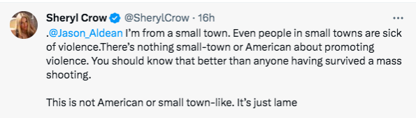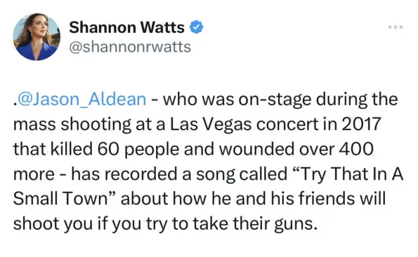 “@Jason_Aldean I’m from a small town. Even people in small towns are sick of violence.There’s nothing small-town or American about promoting violence. You should know that better than anyone having survived a mass shooting. This is not American or small town-like. It’s just lame”