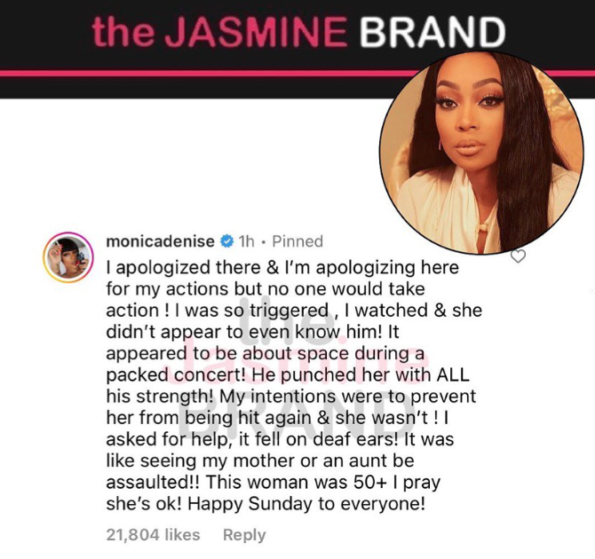 “I apologized there & I’m apologizing here for my actions but no one would take action ! I was so triggered , I watched & she didn’t appear to even know him! It appeared to be about space during a packed concert! He punched her with ALL his strength! My intentions were to prevent her from being hit again & she wasn’t ! I asked for help, it fell on deaf ears! It was like seeing my mother or an aunt be assaulted!! This woman was 50+ I pray she’s ok! Happy Sunday to everyone!”