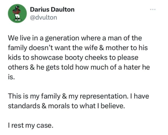 “We live in a generation where a man of the family doesn’t want the wife & mother to his kids to showcase booty cheeks to please others & he gets told how much of a hater he is. This is my family & my representation. I have standards & morals to what I believe. I rest my case.”