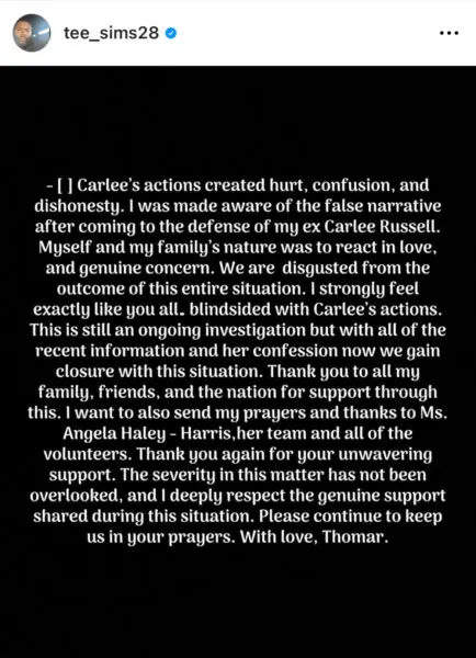 “Carlee’s actions created hurt, confusion, and dishonesty. I was made aware of the false narrative after coming to the defense of my ex Carlee Russell. Myself and my family’s nature was to react in love, and genuine concern. We are disgusted from the outcome of this entire situation. I strongly feel exactly like you all. blindsided with Carlee’s actions. This is still an ongoing investigation but with all of the recent information and her confession now we gain closure with this situation. Thank you to all my family, friends, and the nation for support through this. I want to also send my prayers and thanks to Ms. Angela Haley – Harris, her team and all of the volunteers. Thank you again for your unwavering support. The severity in this matter has not been overlooked, and I deeply respect the genuine support shared during this situation. Please continue to keep us in your prayers. With love, Thomar.”