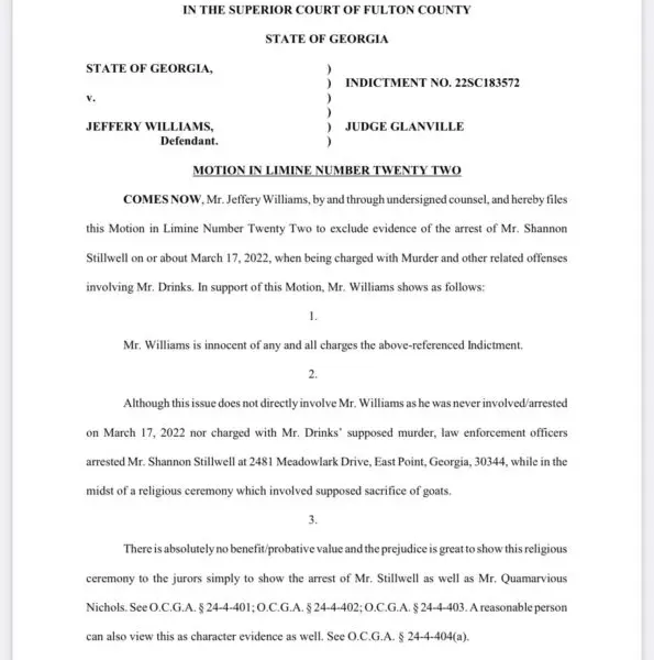 “Although this issue does not directly involve Mr. Williams as he was never involved/arrested on March 17, 2022 nor charged with Mr. Drinks’ supposed murder, law enforcement officers arrested Mr. Shannon Stillwell at 2481 Meadowlark Drive, East Point, Georgia, 30344, while in the midst of a religious ceremony which involved supposed sacrifice of goats.”