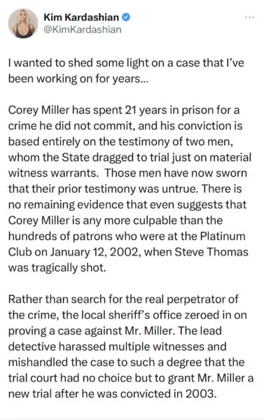 George Thomas’ comments come after Kim Kardashian shared a statement on her Twitter account defending C-Murder’s release “for a crime he did not commit.” In the lengthy post, she noted a new Louisiana law that allows the incarcerated to prove their innocence by submitting new factual evidence. In addition, she mentioned that C-Murder’s conviction is based on the testimony of two men who have both recanted their statements.