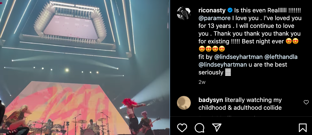 “Is this even Reallllll !!!!!!! @paramore I love you . I’ve loved you for 13 years . I will continue to love you . Thank you thank you thank you for existing !!!!! Best night ever “