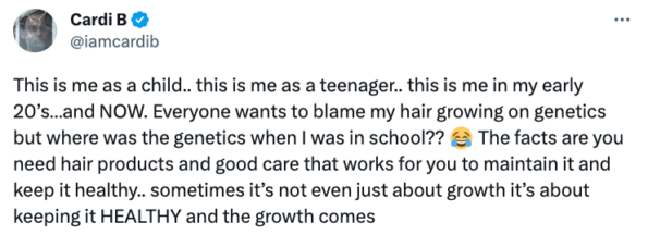 In a subsequent Twitter post, Cardi directly addressed her naysayers by sharing images from her childhood and young adult years, seemingly discrediting their point that genetics is the reason for her hair achievements. She wrote alongside the old photo’s: