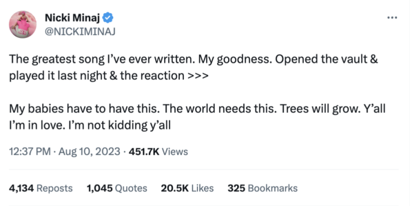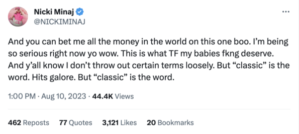 In June, the “Super Freaky Girl” rapper revealed that she was pushing back her album release date to November. Earlier that month, Minaj told her followers that her forthcoming album would be released on 10/20/23 – however, it appears things quickly changed.