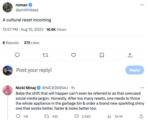 The “Barbie World” rapper later replied to another fan who called the mystery song a “cultural reset.”