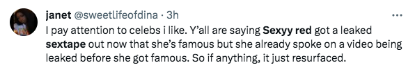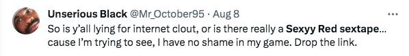 Although the experience invaded Red’s bedroom business, she confessed that she enjoyed the intimate encounter with the person, and it “turned her up” when it came to the weight that her name held in the cyber world.