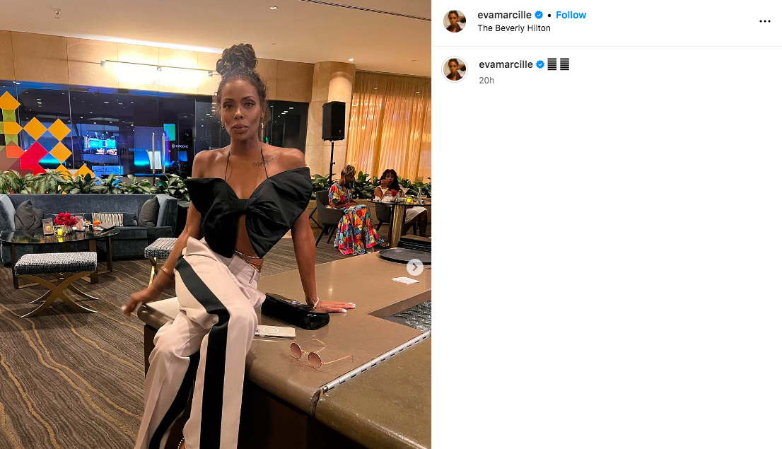 The mother-of-three recently had to turn off the comments on one of her latest Instagram posts because she was receiving an overwhelming amount of negative remarks. In the image, Eva Marcille is pictured sitting with her legs crossed while rocking a bow-inspired black top and white pants that have a black stripe on the side.