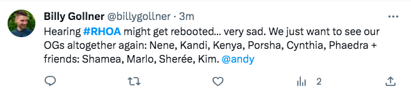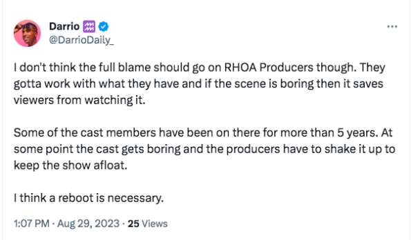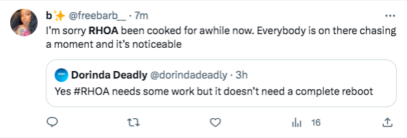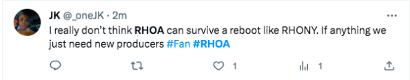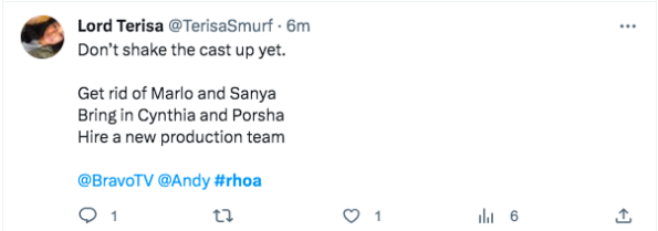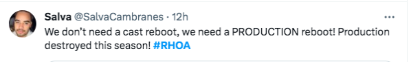 “We don’t need a cast reboot, we need a PRODUCTION reboot! Production destroyed this season! #RHOA”
