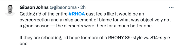 “Getting rid of the entire #RHOA cast feels like it would be an overcorrection and a misplacement of blame for what was objectively not a good season — the elements were there for a much better one.”