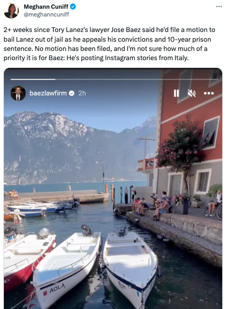 “2+ weeks since Tory Lanez’s lawyer Jose Baez said he’d file a motion to bail Lanez out of jail as he appeals his convictions and 10-year prison sentence. No motion has been filed, and I’m not sure how much of a priority it is for Baez: He’s posting Instagram stories from Italy.”