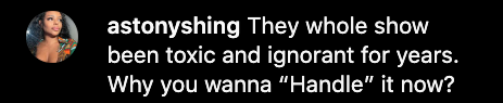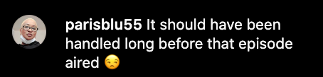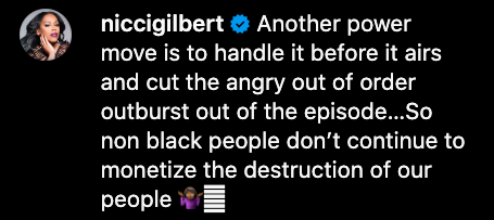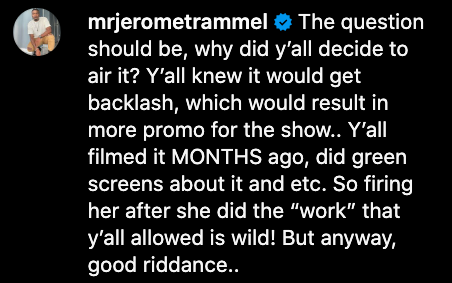 “The question should be, why did y’all decide to air it? Y’all knew it would get backlash, which would result in more promo for the show.. Y’all filmed it MONTHS ago, did green screens about it and etc. So firing her after she did the “work” that y’all allowed is wild! But anyway, good riddance..”
