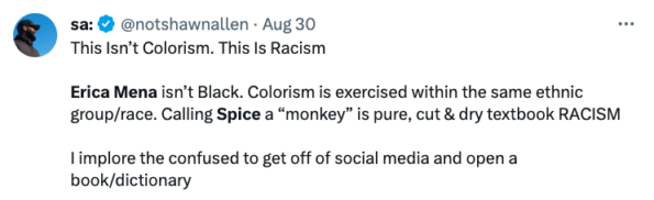 Erica Mena isn’t Black. Colorism is exercised within the same ethnic group/race. Calling Spice a “monkey” is pure, cut & dry textbook RACISM