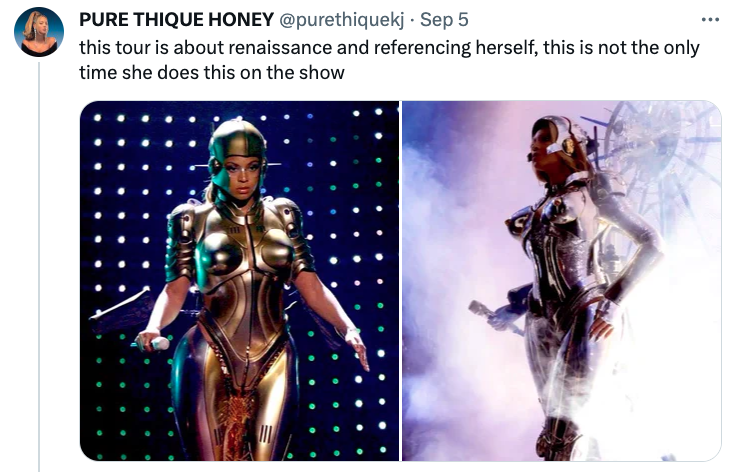 Another user simply pointed out the recurring futuristic theme of the “Renaissance Tout”, arguing that Beyoncé is referencing no one but herself.