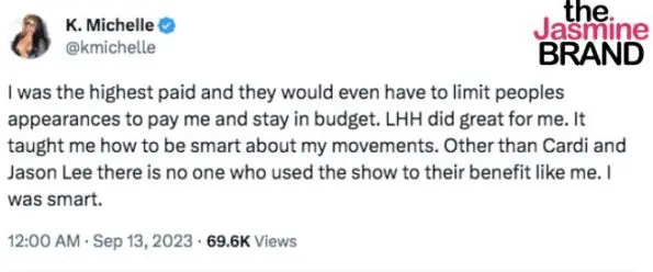 “I was the highest paid and they would even have to limit peoples appearances to pay me and stay in budget. LHH did great for me. It taught me how to be smart about my movements. Other than Cardi and Jason Lee there is no one who used the show to their benefit like me. I was smart.”