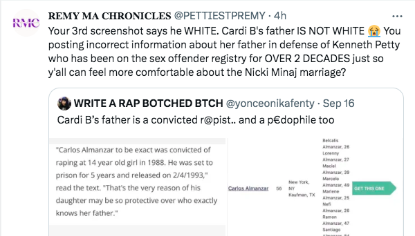 “Your 3rd screenshot says he WHITE. Cardi B’s father IS NOT WHITE. You posting incorrect information about her father in defense of Kenneth Petty who has been on the sex offender registry for OVER 2 DECADES just so y’all can feel more comfortable about the Nicki Minaj marriage?”