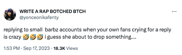 “Replying to small barbz accounts when your own fans crying for a reply is crazy. I guess [Cardi B] about to drop something….”