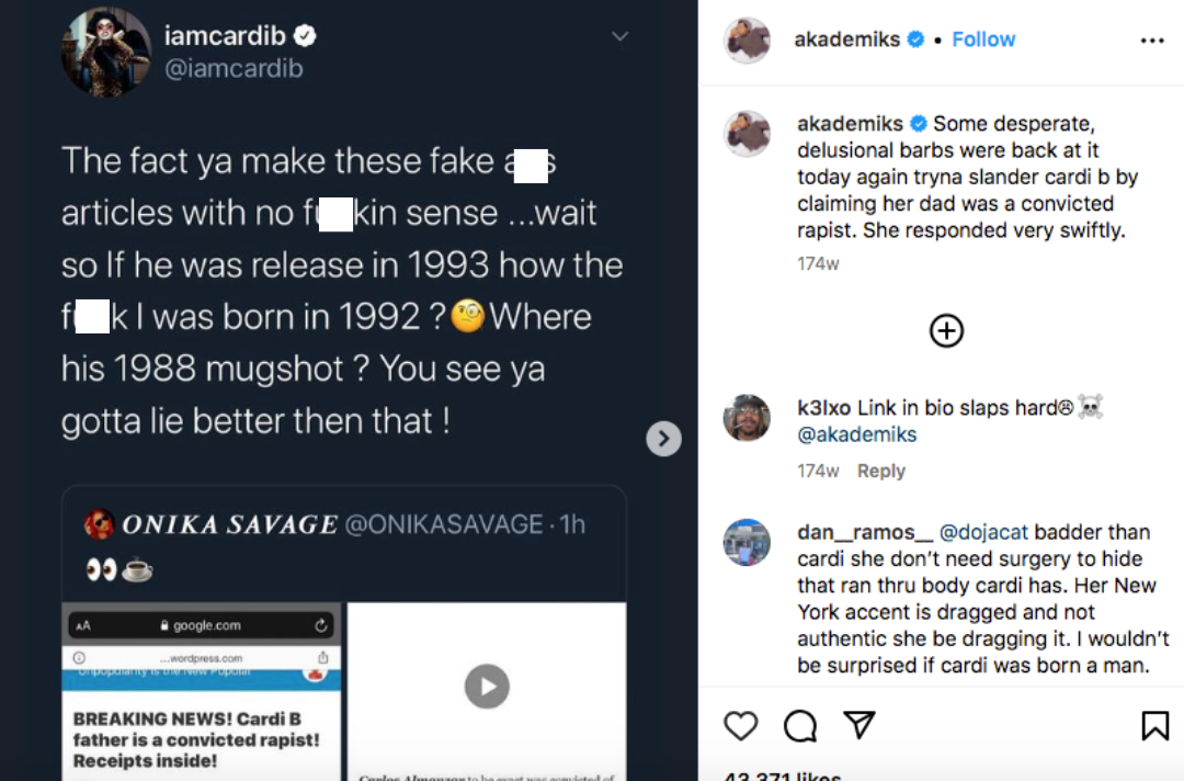 They then jumped to Cardi B’s aid, highlighting the invalidness of the said “proof” about Cardi’s father’s said run-in with the law.
