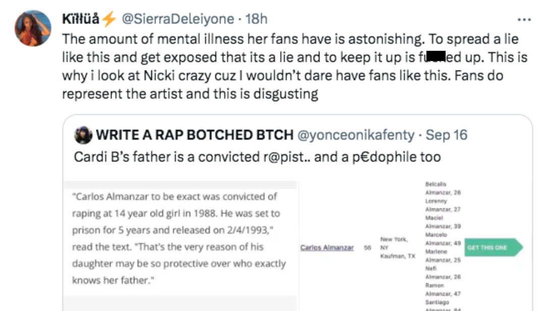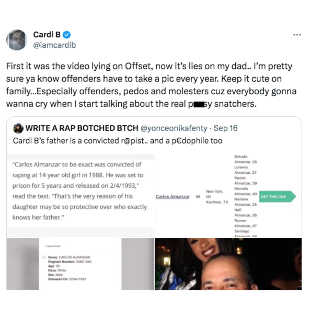 “Cardi B’s father is a convicted r@pist.. and a p€dophile too.”