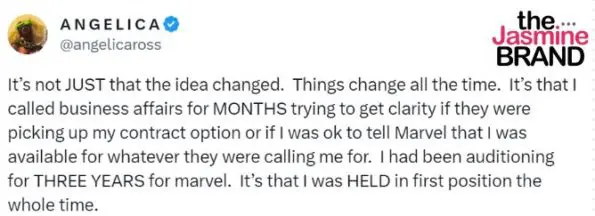 “It’s not JUST that the idea changed. Things change all the time. It’s that I called business affairs for MONTHS trying to get clarity if they were picking up my contract option or if I was ok to tell Marvel that I was available for whatever they were calling me for. I had been auditioning for THREE YEARS for marvel. It’s that I was HELD in first position the whole time.”