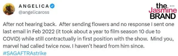 “After not hearing back. After sending flowers and no response I sent one last email in Feb 2022 (it took about a year to film season 10 due to COVID) while still contractually in first position with the show. Mind you, marvel had called twice now. I haven’t heard from him since. #SAGAFTRAstrike.”