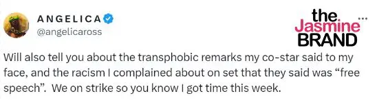 “Will also tell you about the transphobic remarks my co-star said to my face, and the racism I complained about on set that they said was “free speech”. We on strike so you know I got time this week.”