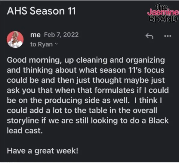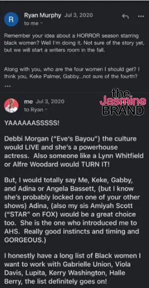 The actress provided emails allegedly between herself and Ryan Murphy that date back to July 2020 to support her claims. According to the emails, Ryan Murphy contacted Ross to get the ball rolling on an “AHS” season that would predominantly feature Black women. Murphy even asked for Ross’ input on the cast for the anthology series. Debbi Morgan, Lynn Whitfield, Viola Davis, Lupita Nyong’o, Halle Berry, and Amiyah Scott were all named during their email exchange.