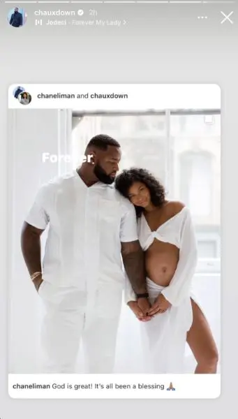 Davon Godchaux, who plays for the New England Patriots, showed his excitement about growing his family with Iman by sharing images of the intimate shoot to his Instagram story. He included the Jodeci song “Forever My Lady” with the upload.