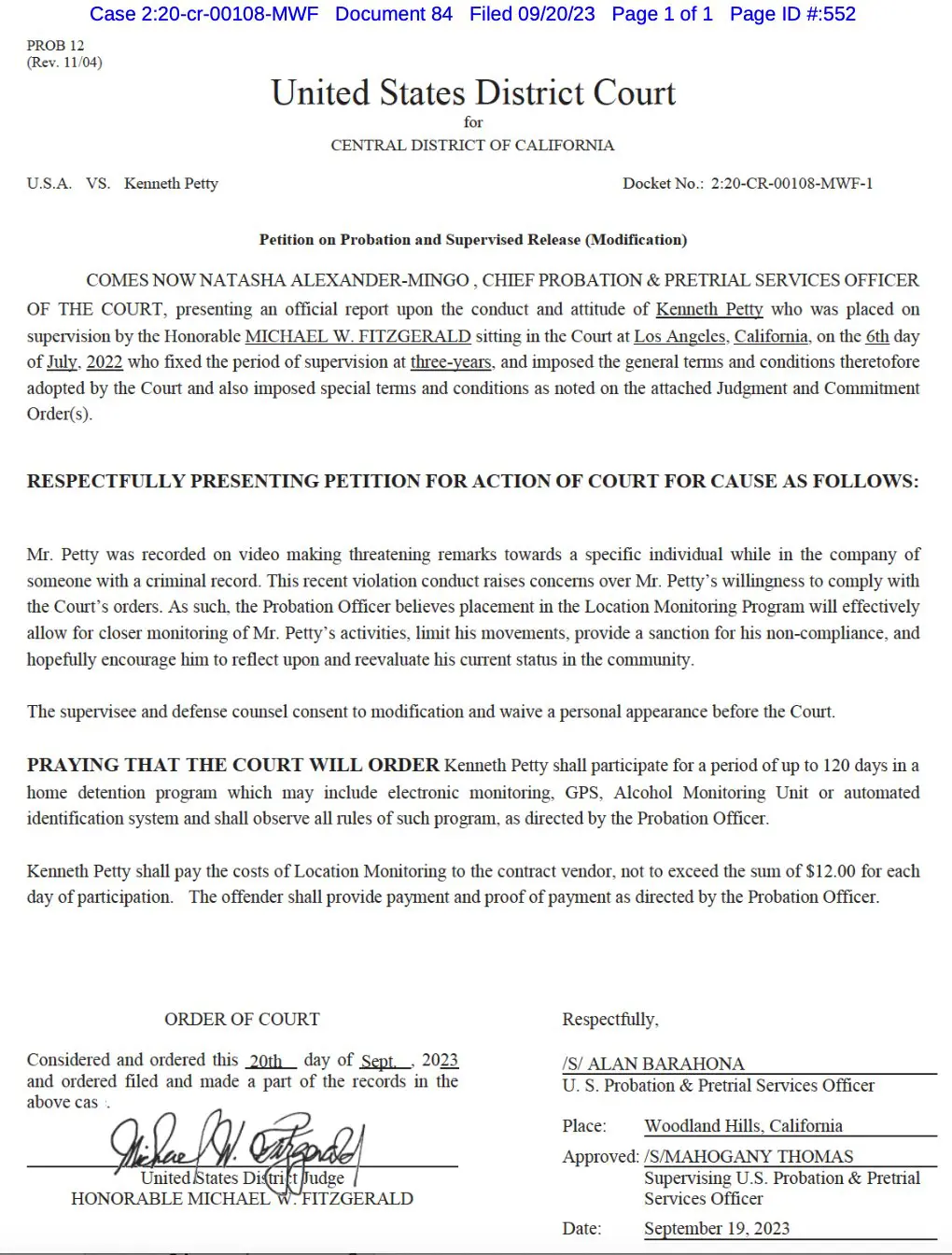 “Mr. Petty was recorded on video making threatening remarks towards a specific individual while in the company of someone with a criminal record. This recent violation conduct raises concerns over Mr. Petty’s willingness to comply with the Court’s orders.”