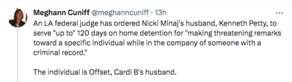 Offset’s mate, fellow rapper Cardi B, responded to the news by co-signing a tweet from blogger ItsKenBarbie who cited that Petty is only to blame for being put back on the ankle monitor.