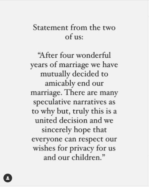 “After four wonderful years of marriage we have mutually decided to amicably end our marriage. There are many speculative narratives as to why but, truly this is a united decision and we sincerely hope that everyone can respect our wishes for privacy for us and our children.”