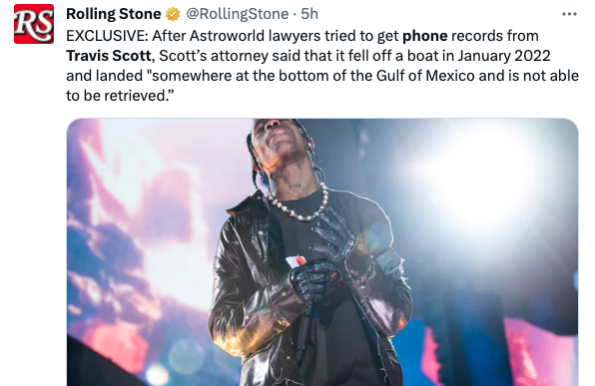 Reportedly, the “Utopia” artist’s lawyers told the courts the phone in question fell off a boat nearly two years ago in the Gulf of Mexico and was never recovered. However, the plaintiff’s legal team seemingly suggested foul play, arguing that Scott’s lawyer’s previously denied them the cell phone information, citing it sought “confidential and/or sensitive information,” and was “seeking the disclosure of documents that are unreasonably cumulative or duplicative of other of the requests.” The plaintiff’s legal team added that after being granted a court order to secure the records, however, now the phone is in the ocean.