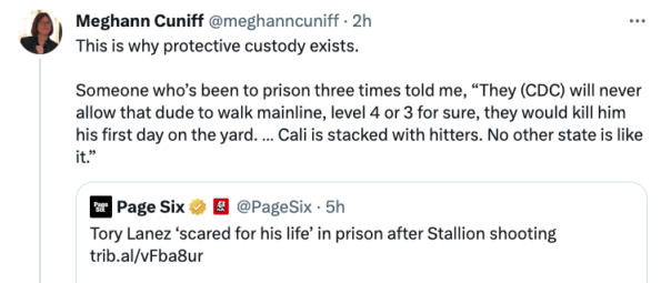 “This is why protective custody exists. Someone who’s been to prison three times told me, “They (CDC) will never allow that dude to walk mainline, level 4 or 3 for sure, they would kill him his first day on the yard. … Cali is stacked with hitters. No other state is like it.”