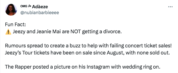 “Fun Fact: Jeezy and Jeanie Mai are NOT getting a divorce. Rumours spread to create a buzz to help with failing concert ticket sales! Jeezy’s Tour tickets have been on sale since August, with none sold out. The Rapper posted a picture on his Instagram with wedding ring on.”