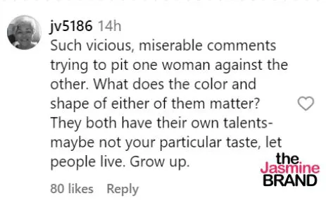 “Such vicious, miserable comments trying to pit one woman against the other. What does the color and shape of either of them matter? They both have their own talents- maybe not your particular taste, let people live. Grow up.”