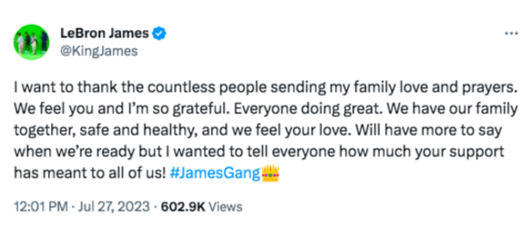 “I want to thank the countless people sending my family love and prayers. We feel you and I’m so grateful. Everyone doing great. We have our family together, safe and healthy, and we feel your love. Will have more to say when we’re ready but I wanted to tell everyone how much your support has meant to all of us! #JamesGang”