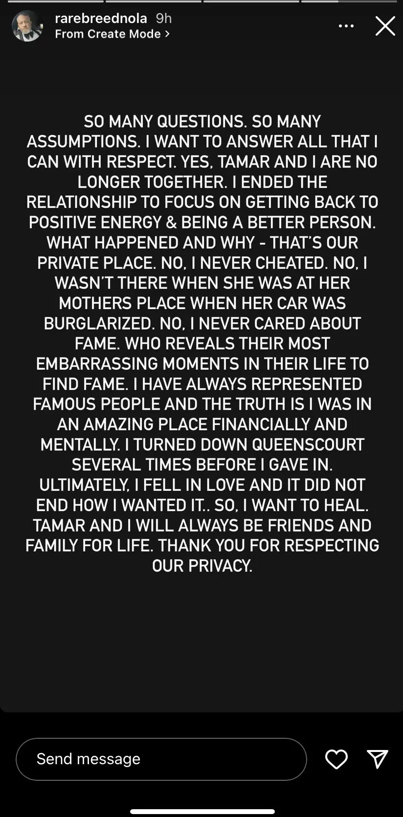 “So many questions. So many assumptions. I want to answer all that I can with respect. Yes, Tamar [Braxton] and I are no longer together. I ended the relationship to focus on getting back to positive energy & being a better person. What happened and why — that’s our private place.”