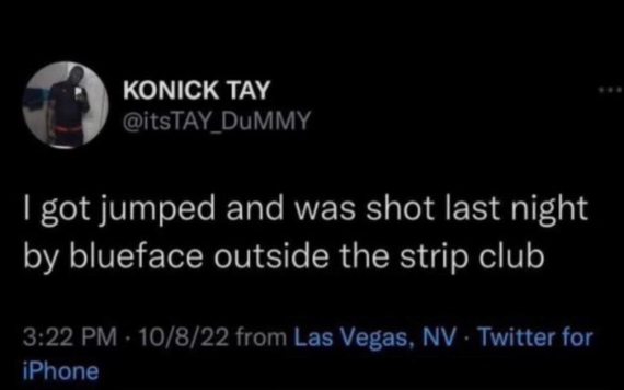 “I got jumped and was shot last night by blueface outside the strip club.”
